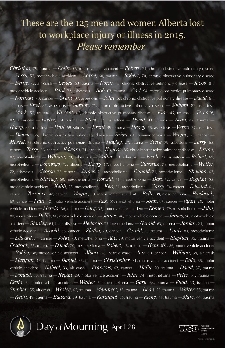 The Edmonton and District Labour Council (EDLC) is hosting a Day of Mourning ceremony on Thursday, April 28, 2016 to recognize those workers killed and injured at work and to recommit to working toward ending workplace deaths and injuries. The ceremony will be held at the Broken Families Obelisk from 6-7 p.m. at Grant Notley Park (11603-100 Avenue) with a reception to follow. Questions about the EDLC event may be directed to: melissahfield@gmail.com or the EDLC office at 780-474-4747 or office@edlc.ca.