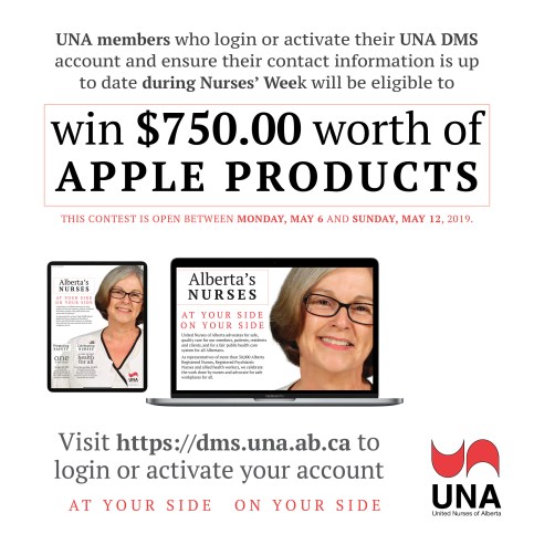 UNA members who login or activate their UNA DMS account and ensure their contact information is up to date during Nurses’ Week will be eligible to win $750.00 worth of Apple products. This contest is open between Monday, May 6 and Sunday, May 12, 2019.
