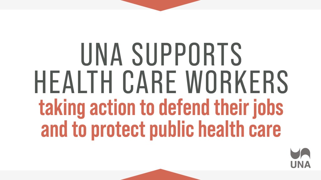 UNA supports the health care workers who are defending the principle of public health care and opposing the efforts of the Kenney Government to undermine the public health care system and destroy thousands of jobs. UNA members will not do the work of other union members.