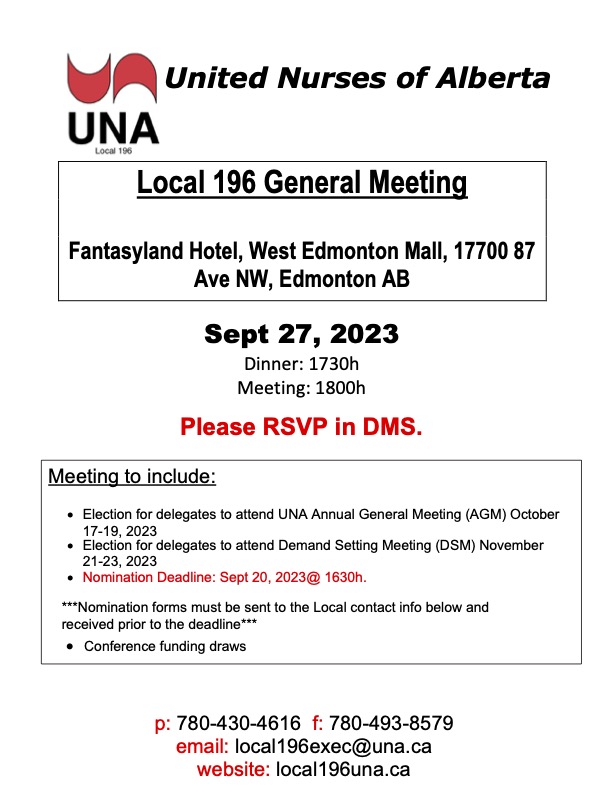 ** Please note that registration is currently CLOSED due to the amount of registrants and capacity of the booked space at the Fantasyland hotel. If you need to cancel your registration, or if you are not registered and would like to attend if there are any cancellations please email local196exec@una.ca