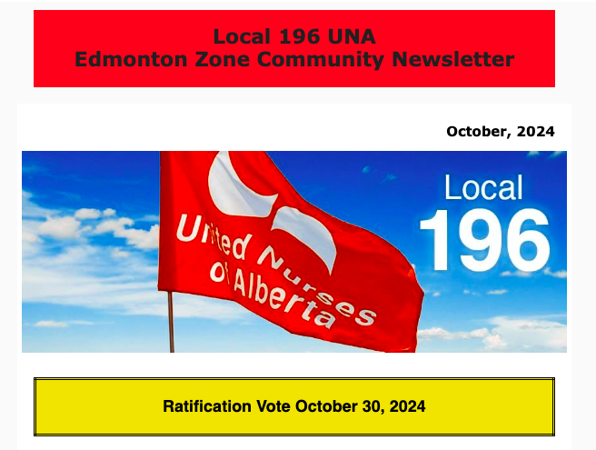 The Local newsletter was sent via MailChimp with updated member contact information from the Provincial UNA Office. It was sent to personal email addresses only. If you did not receive our newsletter, please update your contact information in UNA’s DMS system and email local196exec@una.ca to be added to our subscribers list. You don’t want to miss out!