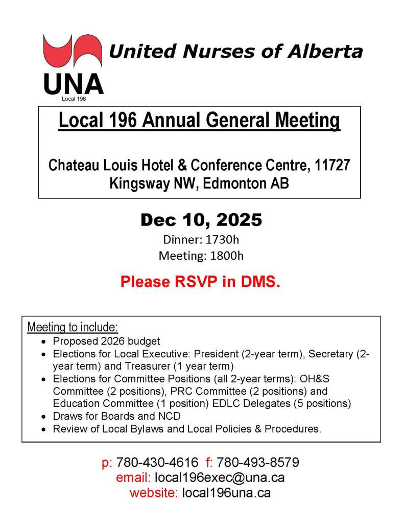 You must FULLY complete (including names, addresses, membership numbers and signatures) a nomination form before the deadline of DECEMBER 3, 2025, to local196exec@una.ca