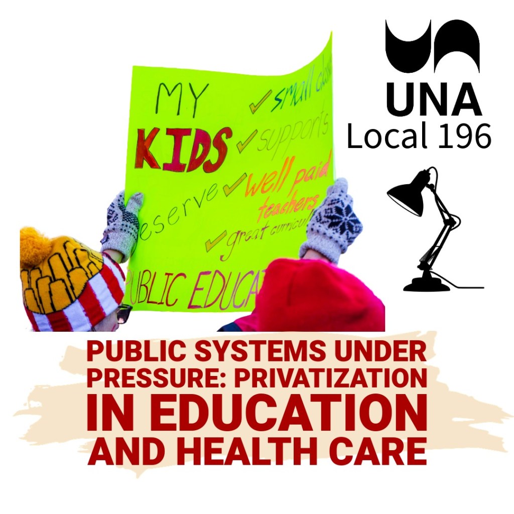 Privatization is becoming more evident in Alberta’s public systems, especially in education and health care. In schools, increased funding for private and charter programs has raised concerns about creating a two-tier system that diverts resources from public classrooms and deepens inequities. Educators warn that this shift reframes education as a product rather than a universal right.