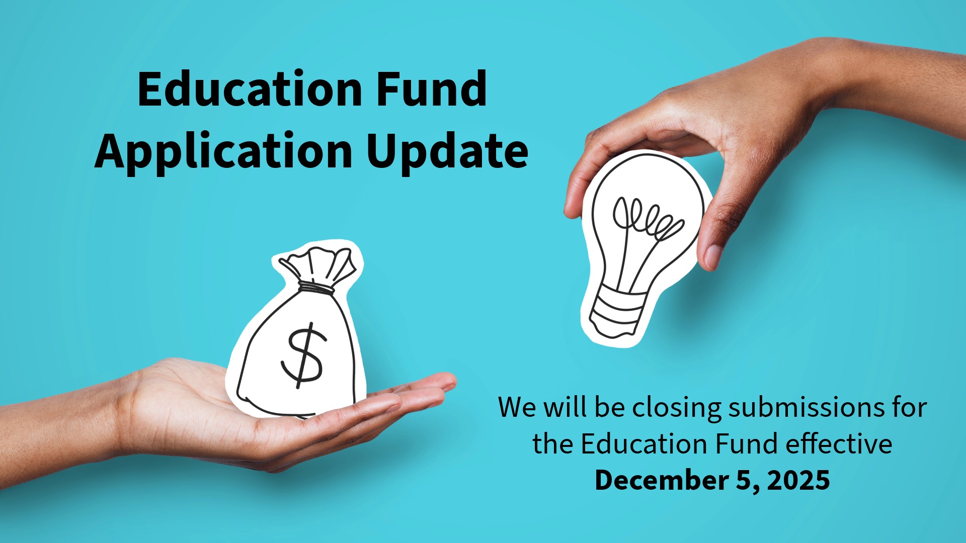 Due to an unexpected and significant influx of applications and due to funds remaining, we will be closing submissions for the Education Fund effective December 5, 2025.