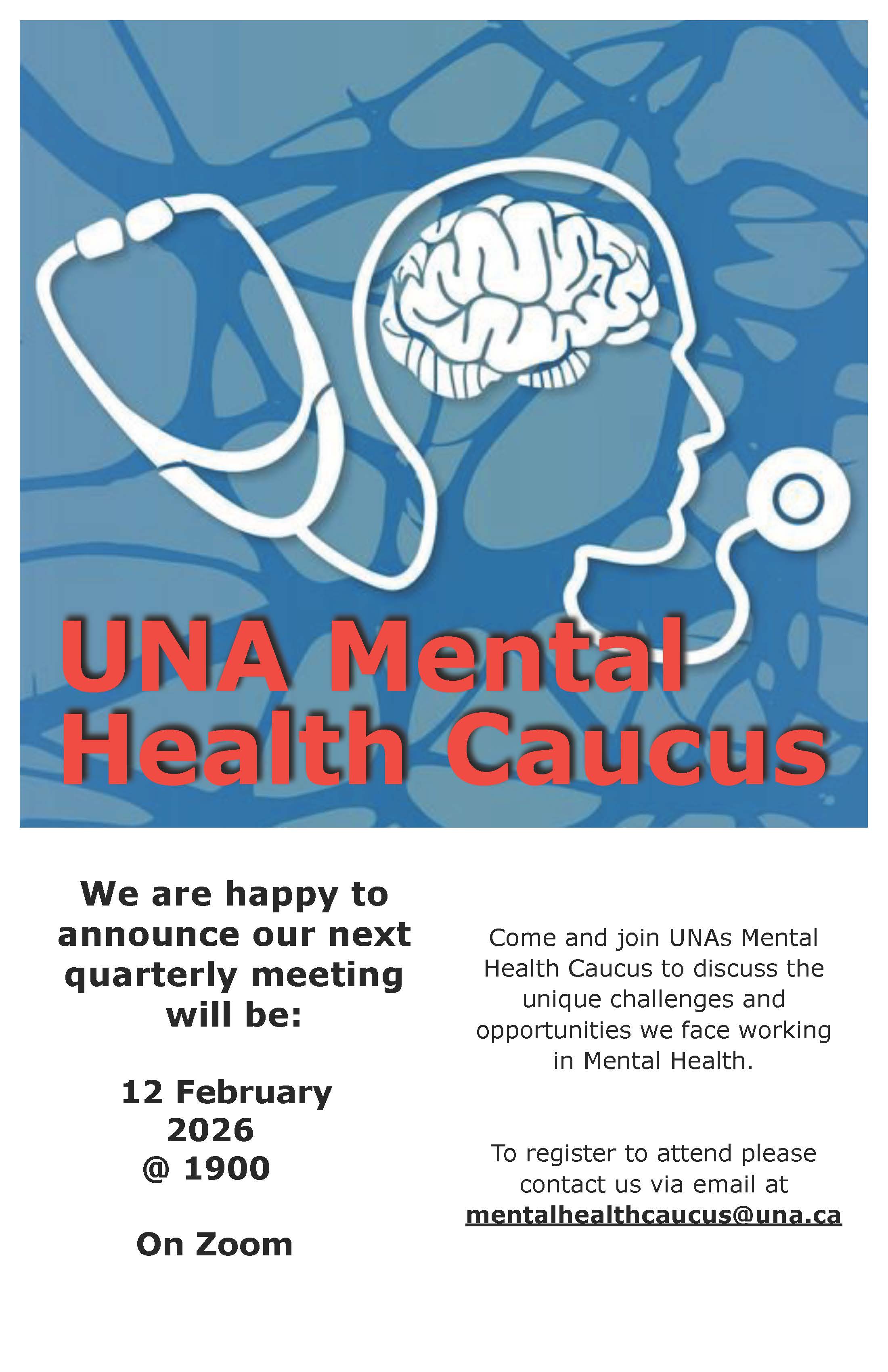 UNA’s Mental Health Caucus offers an opportunity for information sharing and networking for nurses who work in mental health. The Mental Health Caucus offers an opportunity for advocacy and sharing perspectives of mental health nursing within the greater community of nurses and UNA. The Mental Health Caucus offers itself as a resource to locals and the provincial organization to help expand the perspectives of mental health nurses.