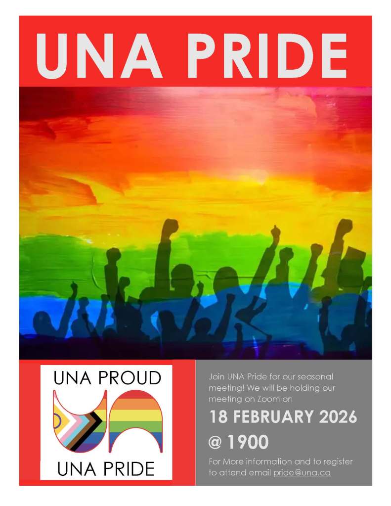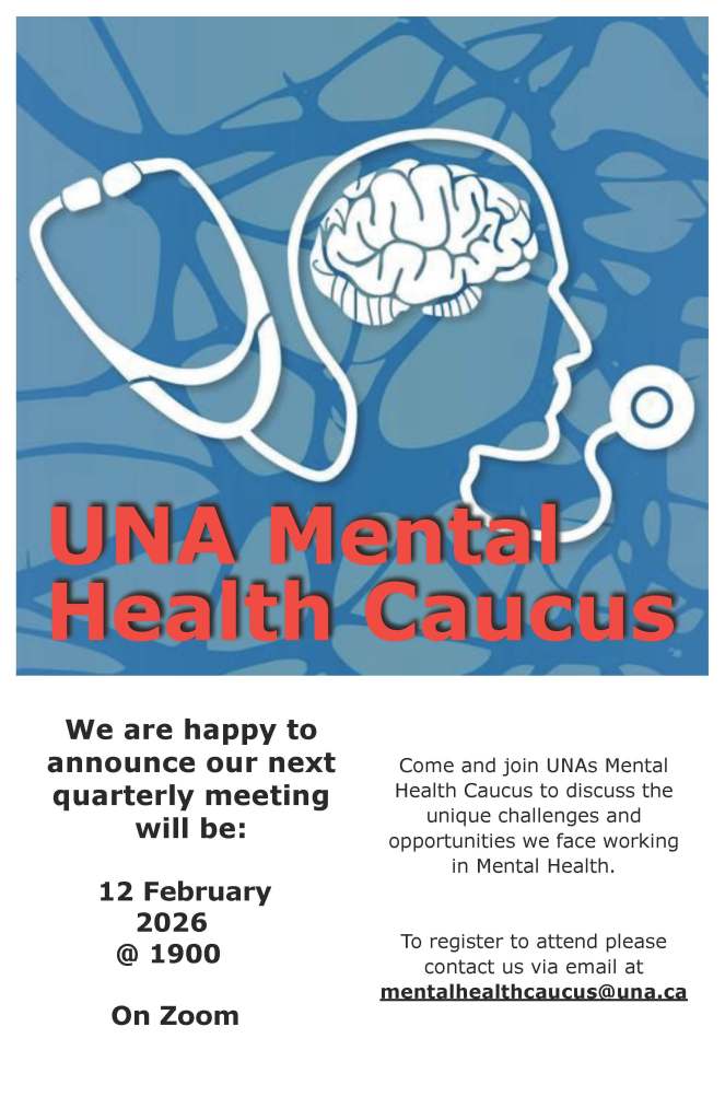 The Mental Health Caucus has the next meeting coming up on 12 February 2026 @ 1900, to register, email mentalhealthcaucus@una.ca