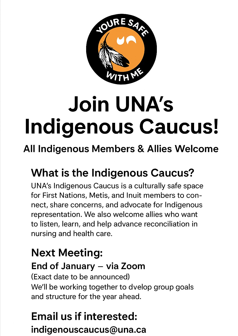 UNA’s Indigenous Caucus provides a culturally safe space for First Nations, Métis, and Inuit members to connect, share concerns, and advocate for Indigenous voices within UNA. The caucus supports members in addressing Indigenous-specific racism and advancing reconciliation in nursing and health care.