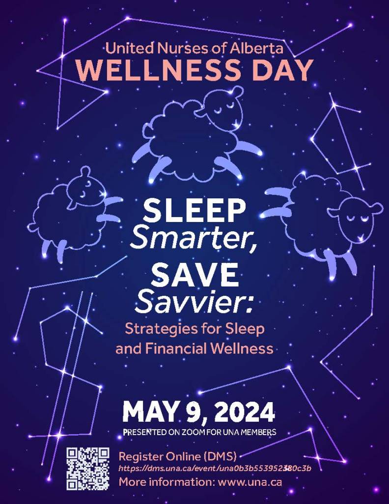 United Nurses of Alberta members are invited to register to participate in the union’s online Wellness Day event on May 9, 2024, with the theme of “Sleep Smarter, Save Savvier: Strategies for Sleep and Financial Wellness.”