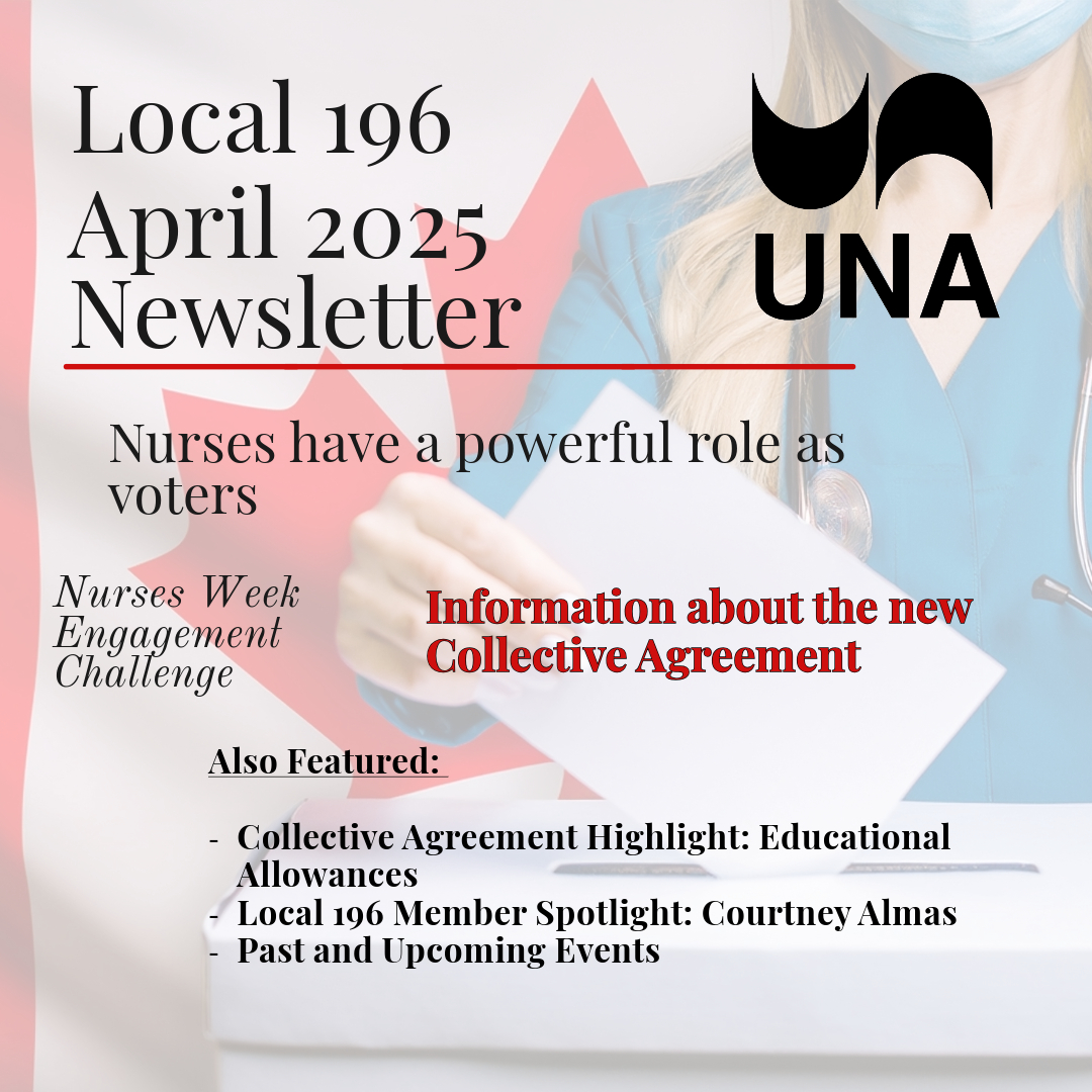 The Local newsletter was sent via MailChimp with updated member contact information from the Provincial UNA Office. It was sent to personal email addresses only. Please update your contact information in UNA’s DMS system if you have not received our newsletter.